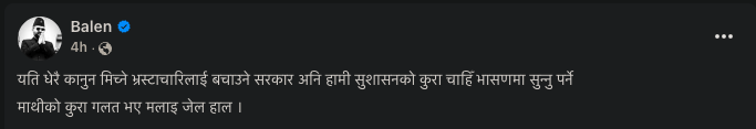बालेनले गुरागाईंलाई भ्रष्टाचारीको संज्ञासमेत दिएका छन् । ‘यति धेरै कानून मिच्ने भ्रष्टाचारीलाई बचाउने सरकार अनि हामीले सुशासनको कुरा चाहिँ भाषणमा सुन्नुपर्ने ? माथिको कुरा गलत भए मलाई जेल हाल,’ उनले फेसबुकमा लेखेका छन् ।