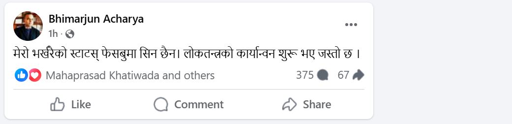तर, आफ्नो स्टाटस अहिले टाइमलाइनमा नदेख्दा आचार्य अचम्ममा परेका छन् । आफ्नो स्टाटस नदेखेपछि उनले अर्को स्टाटस लेख्दै ‘लोकतन्त्रको कार्यान्वयन सुरु भएको आशंका’ गरेका छन् ।