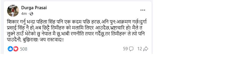 उनले आफूले नेपालमै लुक्ने ठाउँ भेटेको भन्दै तर नेताहरुले भविष्यमा त्यस्तो ठाउँ भेट्न नसक्ने बताएका थिए । फेसबुकमा लेखिएको थियो, ‘सिकार गर्नु भन्दा पहिला सिंह पनि एक कदम पछि हट्छ, अनि पुनः आक्रमण गर्छ ! दुर्गा प्रसाई सिंह नै हो ,अब छिट्टै तिमीहरूको मलामी लिएर आउँदैछ, भ्रष्टाचारी हो ! मैले त लुक्ने ठाउँ भेटेको छु, नेपाल मै छु, भावी रणनीति तयार गर्दैछु, तर तिमीहरूले त्यो पनि पाउँदैनौ, बुझिराख !’