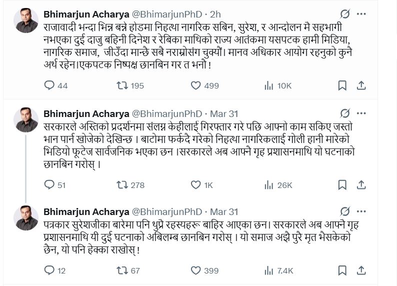 सामाजिक सञ्जाल एक्समा डा. आचार्यले लेखेका छन्, ’सरकारले प्रदर्शनमा संलग्न केहीलाई गिरफ्तार गरेर आफ्नो काम सकिएको भान पार्न खोजेको देखिन्छ। बाटोमा फर्कँदै गरेको निहत्था नागरिकलाई गोली हानेर मारिएको भिडियो फुटेज सार्वजनिक भएका छन्। सरकारले अब आफ्नै गृह प्रशासनमाथि यो घटनाको छानबिन गरोस्।’ उनले थप भनेका छन् , ’पत्रकार सुरेशजीको मृत्युबारे पनि थुप्रै रहस्य बाहिर आएका छन्। सरकारले यी दुई घटनाको अविलम्ब छानबिन गरोस्। यो समाज अझै पूरै मृत भइसकेको छैन, यो पनि हेक्का राखोस्।’