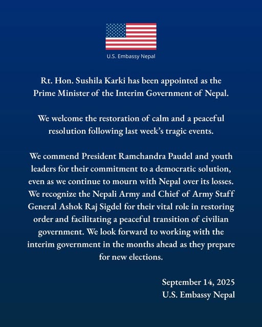 दूतावासले प्रधानमन्त्री सुशीला कार्कीलाई बधाई दिँदै, आन्दोलनकारी युवाहरूको साहस, राष्ट्रपति रामचन्द्र पौडेलको सहजीकरण र लोकतान्त्रिक समाधानप्रतिको प्रतिबद्धताको प्रशंसा गरेको छ।