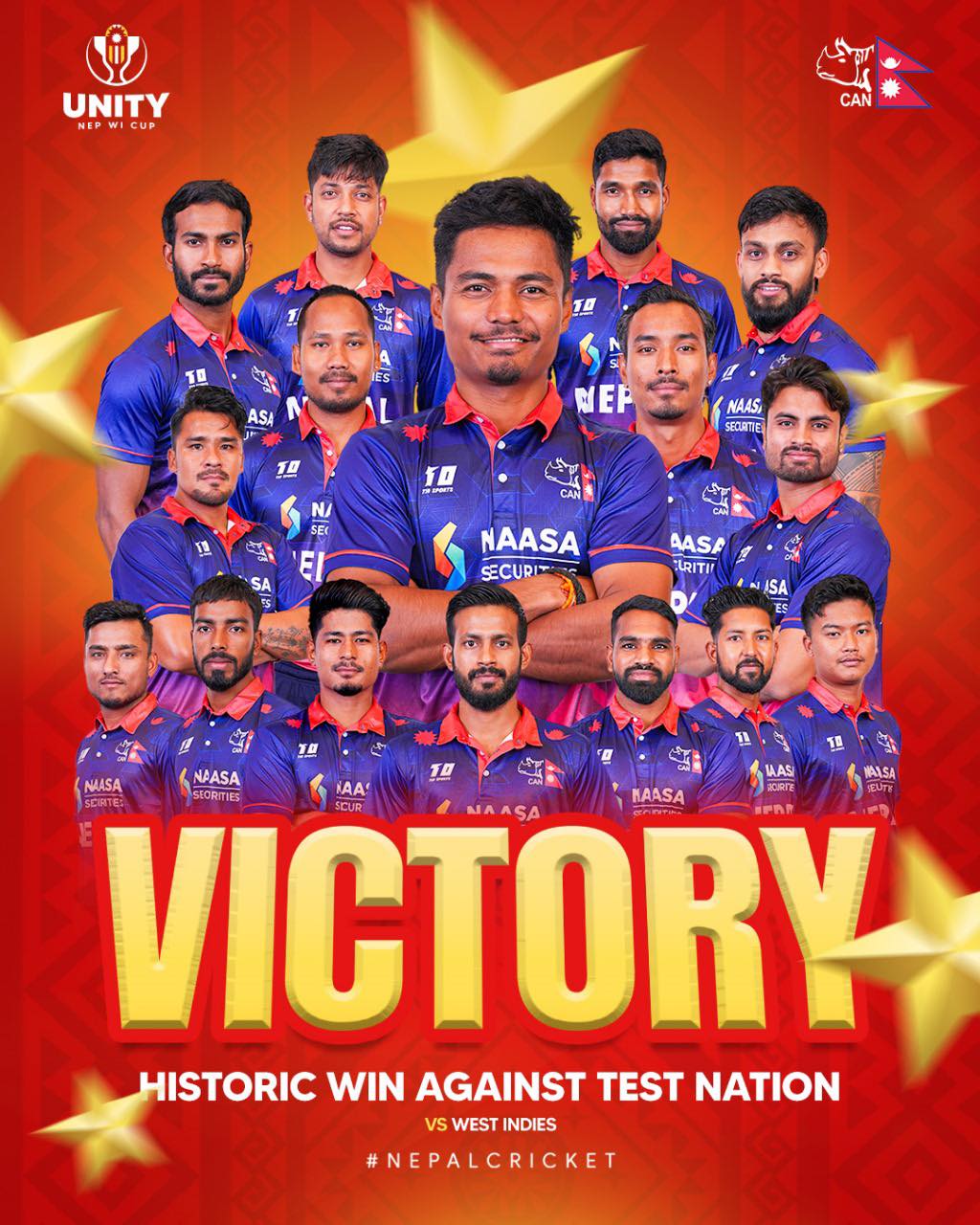 नेपाली क्रिकेटले नयाँ इतिहास रचेको छ । कुनै पनि टेस्ट मान्यता प्राप्त टोलीमाथि नेपालले पहिलो पटक विजय हासिल गरेको छ । शनिबार वेस्टइन्डिजमाथि नेपालले ट्वान्टी–२० अन्तर्राष्ट्रिय क्रिकेटमा एतिहासिक विजय हात पारेको हो ।