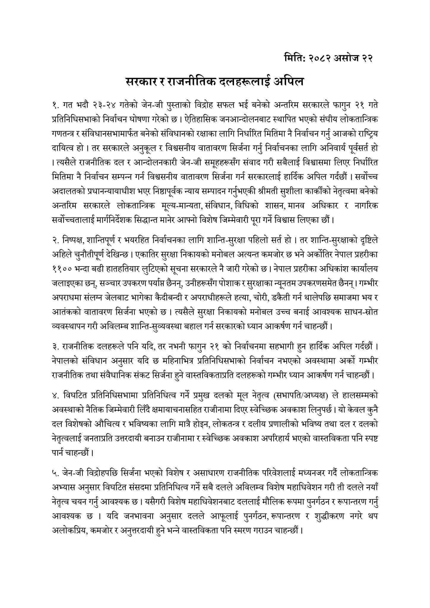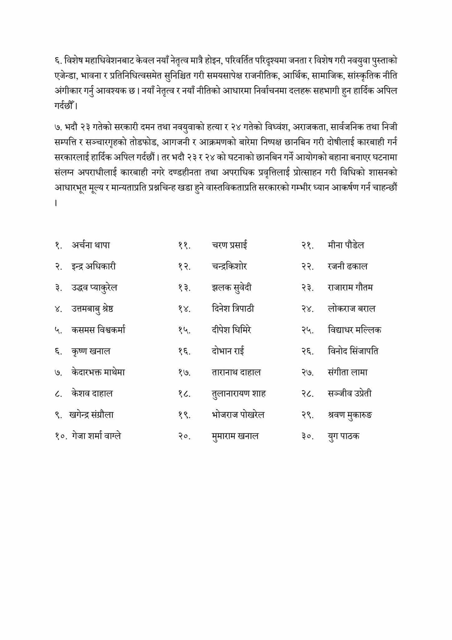 नयाँ नेतृत्व र नयाँ नीतिको आधारमा निर्वाचनमा दलहरू सहभागी हुन पनि उनीहरूले अपिल गरेका छन्। भदौ २३ गतेको सरकारी दमन तथा नवयुवाको हत्या र २४ गतेको विध्वंश, अराजकता, सार्वजनिक तथा निजी सम्पत्ति र सञ्चारगृहको तोडफोड, आगजनी र आक्रमणको बारेमा निष्पक्ष छानबिन गरी दोषीलाई कारबाही गर्न सरकारलाई उनीहरूले आग्रह गरेका छन्।