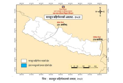 हिजो अक्टोबर १० नेपालको सम्पूर्ण भू–भागबाट यसवर्षको मनसुन बाहिरिएको जल तथा मौसम विज्ञान विभागले जनाएको छ। विभागका अनुसार असोज २० गते (अक्टोबर ६) सुदूरपश्चिम, कर्णालीलगायत लुम्बिनी प्रदेशको पश्चिमी भू–भागको धेरै स्थानहरू र गण्डकी प्रदेशको पश्चिमी भू–भागको थोरै स्थानहरूबाट यस वर्ष मनसुन बाहिरिन सुरु भएको थियो।