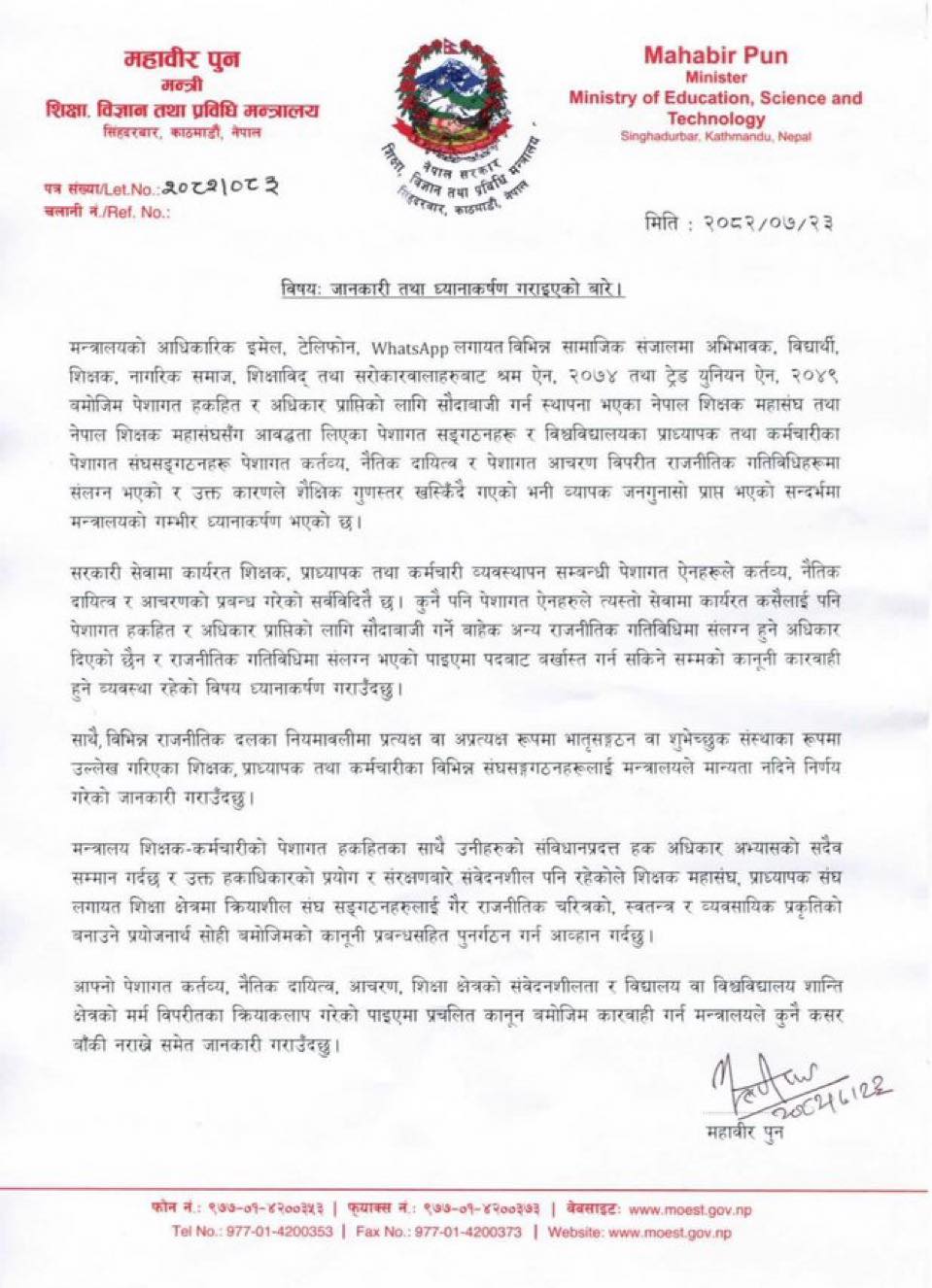 हिजो जारी विज्ञप्तिामा राजनीतिक दलहरूसँग प्रत्यक्ष वा अप्रत्यक्ष रूपमा संलग्न रहेका शिक्षक, प्राध्यापक तथा कर्मचारीहरूका संघसंगठनलाई शिक्षा, विज्ञान तथा प्रविधि मन्त्रालयले मान्यता नदिने उल्लेख छ ।