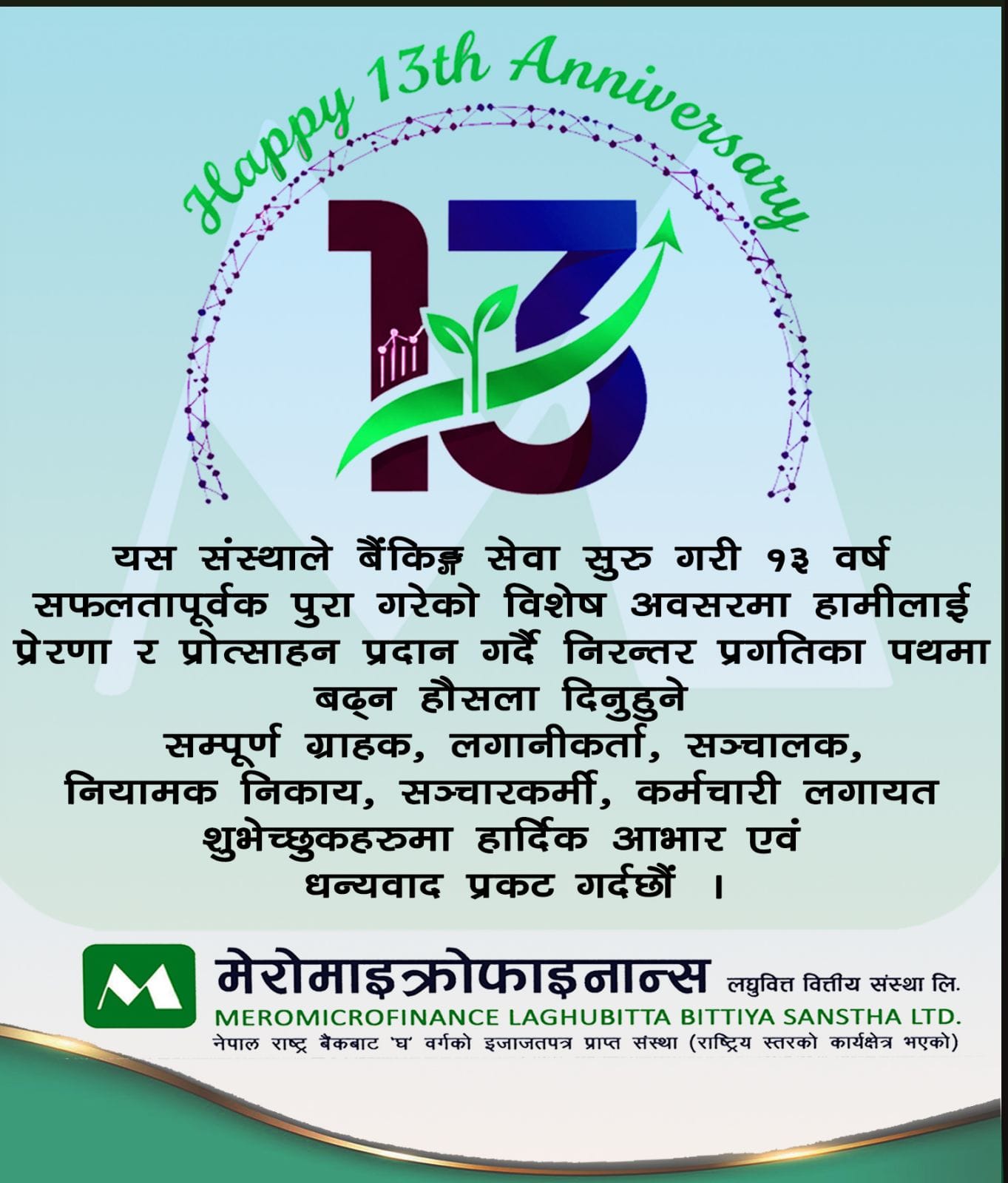 मेरोमाइक्रोफाइनान्सले आफ्नो १३ औं वार्षिक उत्सव मनाएको छ ।