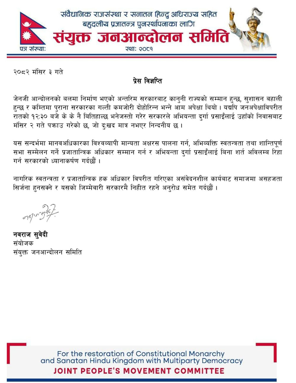 संंवैधानिक राजसंस्था र सनातन हिन्दु अधिराज्यसहित बहुदलीय प्रजातन्त्र पुनस्र्थापनाका लागि संयुक्त जनआन्दोलन समितिले दुर्गा प्रसाईंलाई पक्राउ गरेकामा आपत्ति जनाएको छ ।
