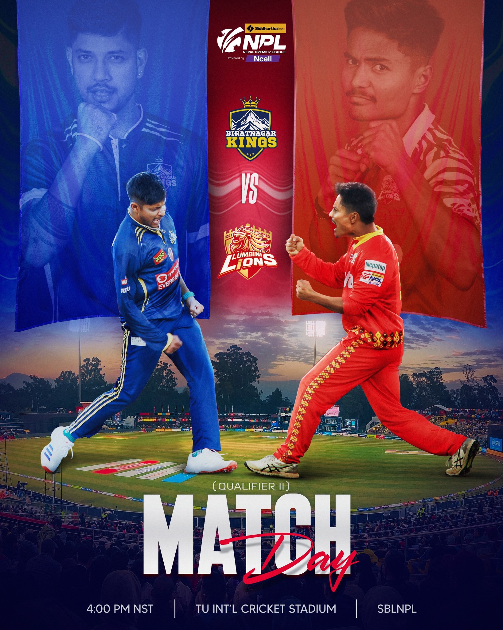 नेपाल प्रिमियर लिग (एनपीएल)को दोस्रो क्वालिफायरमा आज विराटनगर किंग्सलाई लुम्बिनी लायन्सले चुनौती प्रस्तुत गर्दै छ । विराटनगरले यसअघि पहिलो क्वालिफायरमा सुदूरपश्चिम रोयल्ससँग ७७ रनको हार व्यहोरेको थियो ।