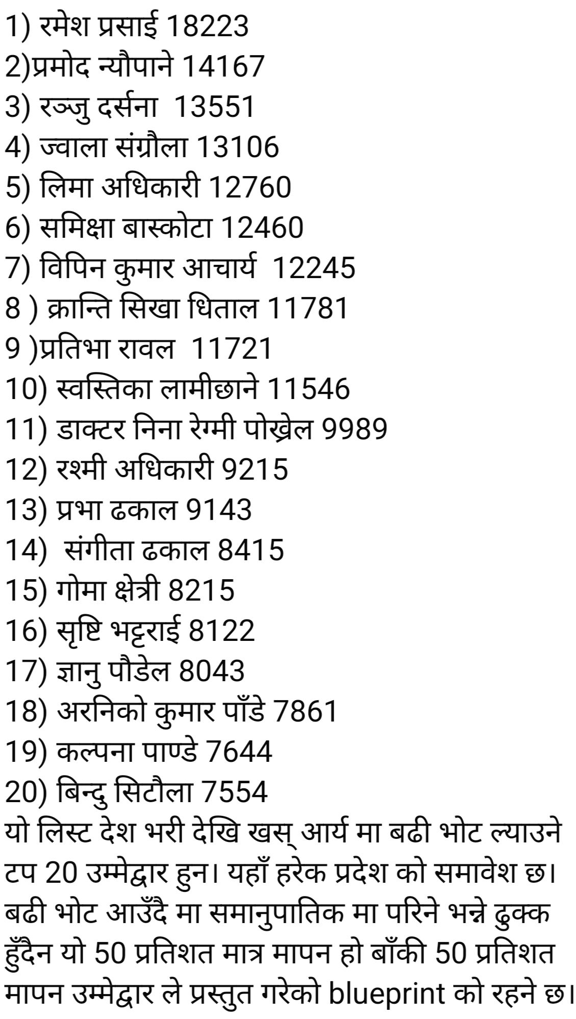 त्यसपछि अमृता विके, सीता वादी, स्मृति सेन्चुरी, सुष्मा स्वर्णकार, गिर्जादेवी मल्लिक, तारा विश्वकर्म र खिमा विक छन् । मधेशी समुदायको पुरुषतर्फ पहिलो नम्बरमा डा. नन्दन यादव र महिलातर्फ पुनम कुमारी अग्रवाल छन् ।