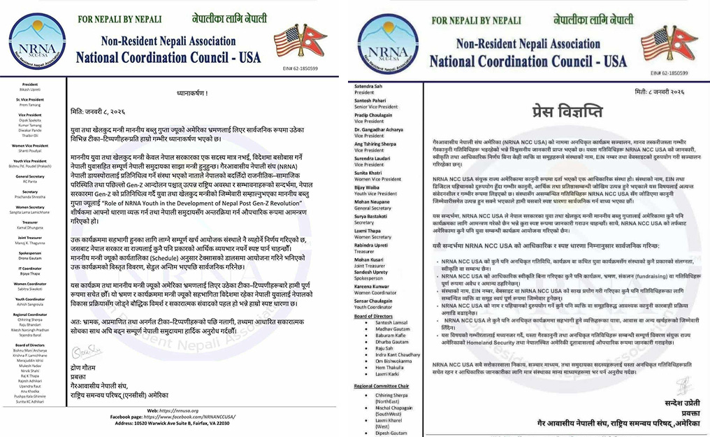 २ समूहमा विभाजित एनआरएन अमेरिकाले दुईथरि विज्ञप्ति निकालेका हुन् । गैरआवासीय नेपाली संघ अमेरिका (एनआरएनए एसीसी युएसए)ले नेपालबाट युवा तथा खेलकुमद मन्त्री बब्लु गुप्तालाई अमेरिका भ्रमणमा नबोलाइएको स्पष्ट पारेको हो ।