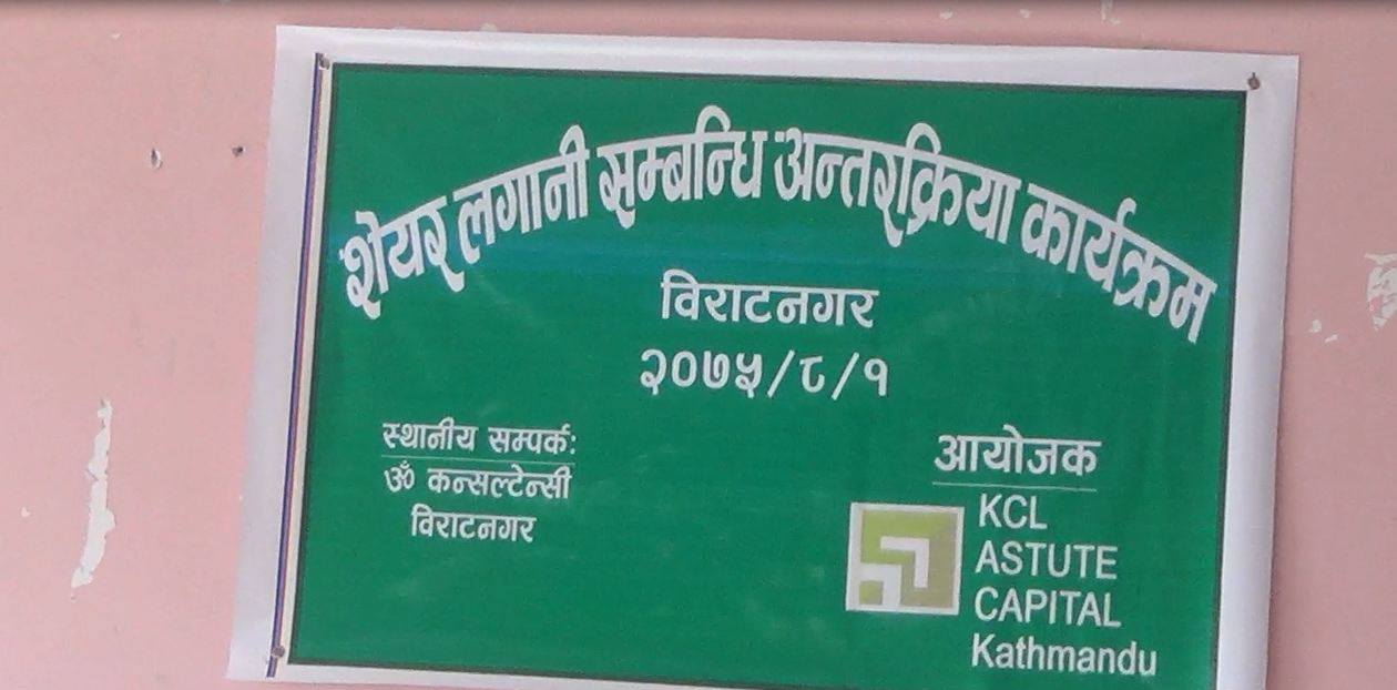 विराटनगरमा शेयर लगानी सम्बन्धि अन्तरक्रिया सम्पन्न भएको छ । केसियल अस्टुट काठमाडौको आयोजना र उँ कन्सल्टेन्सी विराटनगरको संयोजनमा अन्तरक्रिया सम्पन्न भएको हो ।