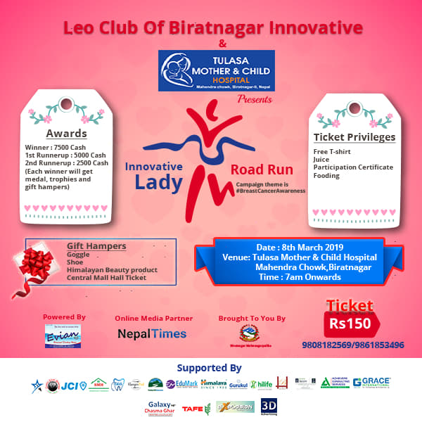 अन्तराष्ट्रिय नारी दिवसका अवसरमा विराटनगरमा ‘लेडी रोड रन’ र स्तन क्यान्सरका विषयमा सचेतनामुलक कार्यक्रम हुने भएको छ । लियो क्लब अफ विराटनगर इनोभेटिभको आयोजना तथा विराटनगर स्थित तुलसा मदर एण्ड चाइल्ड हस्पिटलको सहकार्यक्रममा सो कार्यक्रम आयोजना हुन लागेको हो ।