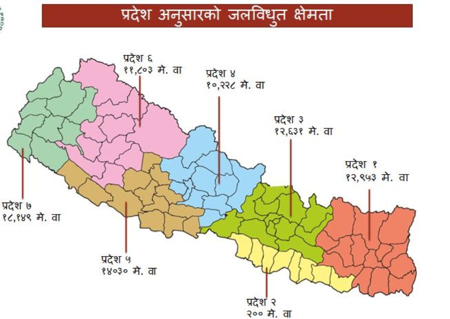 विद्युत उत्पादन हुन सक्ने क्षमताका आधारमा प्रदेश नम्बर २ सबैभन्दा कमजोर पाइएको छ । प्रदेश नम्बर २ मा २ सय मेघावाट मात्रै बिजुली उत्पादन क्षमता रहेको छ । प्रदेश नम्बर ५ मा १४ हजार ३०, प्रदेश १ मा १२ हजार ९ सय ५३, प्रदेश ३ मा १२ हजार ६ सय ३१, प्रदेश ६ मा ११ हजार ८ सय ३ र प्रदेश ४ मा १० हजार २ सय २८ मेघावाट बिजुली उत्पादन हुन सक्ने क्षमता रहेको छ ।
