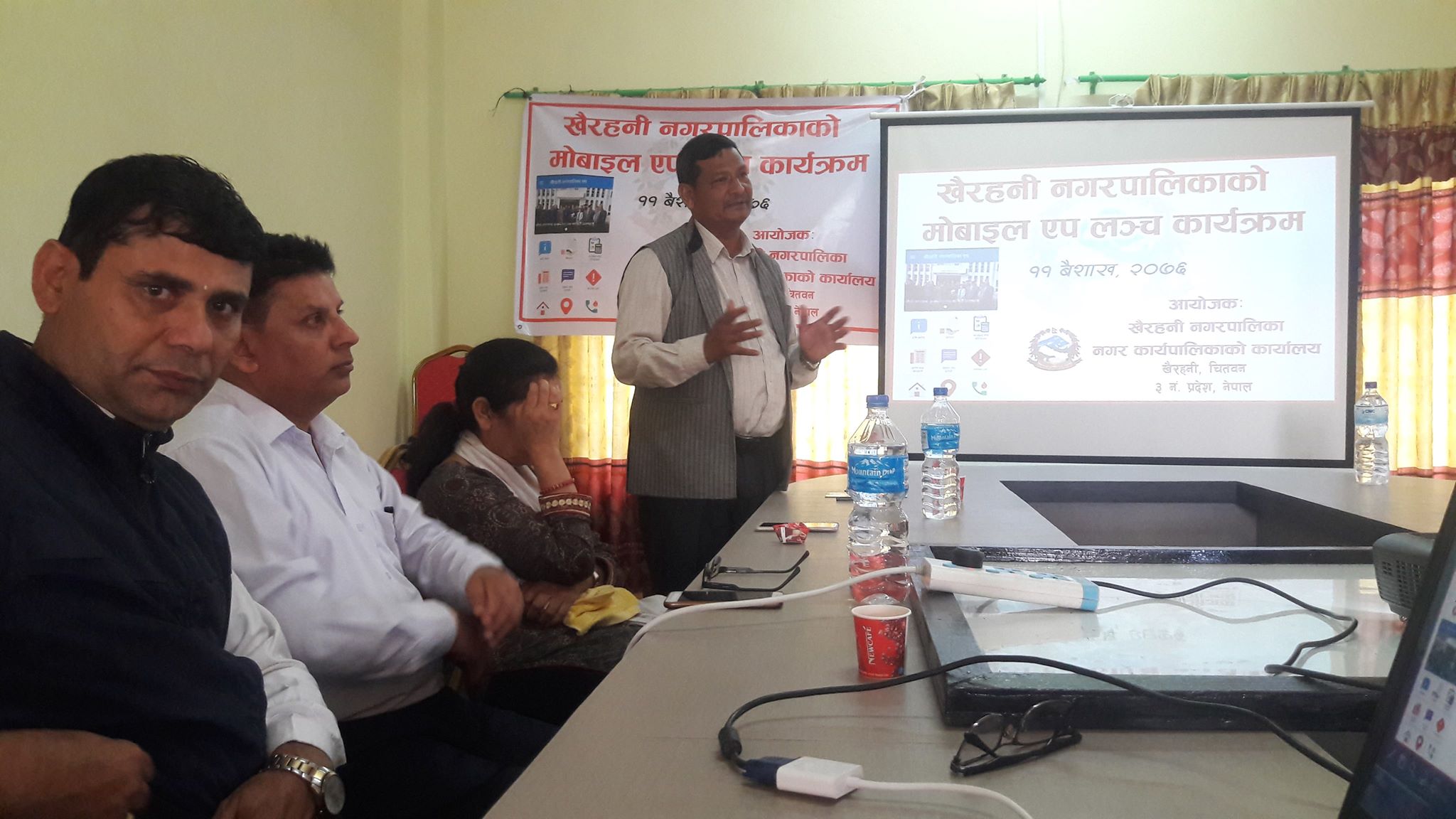 चितवनको खैरहनी नगरपालिकाले सूचना र प्रविधिलाई जोड्ने क्रममा बुधवारदेखी मोवाईल एपको सेवा सुरु गरेको छ । मोवाईल एपमार्फत नगरपालिकाका जनप्रतिनिधीहरुको विवरणसहित अन्य गतिविधीहरु थाहा पाउन सकिने छ । नगरपालिकाका सुचना तथा प्रविधि अधिकृत सुरेश चौधरीका अनुसार मोवाईल एपमार्फत नगरपालिकाको परिचय,जनप्रतिनिधीको विवरण, कर्मचारीको विवरण, कार्यक्रम र वजेट, सुचना, गुनासा तथा सुझाव, धार्मिक पर्यटकीय स्थान, प्रशासनिक निकाय, विभिन्न संघसंस्था, शैक्षिक संस्था,आपतकालिन नम्वर लगायत हेर्न सकिने छ ।