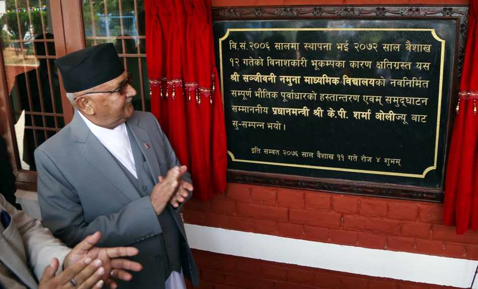 प्रधानमन्त्री केपी शर्मा ओलीले भूकम्पपछि निर्माण गरिएको काभ्रेको धुलिखेलस्थित सञ्जीवनी नमूना माध्यमिक विद्यालय भवनको उद्घाटन गरे । प्रधानमन्त्रीले भूकम्पपछिको पुनर्निर्माणको काम तिव्र गतिमा अघि बढेको बताए । अघिल्लो पटक आफू प्रधानमन्त्री भएका बेला गठन भएको प्राधिकरणले आफ्नो बहिरगमनसँगै काम गर्न नसकेको प्रधानमन्त्री ओलीले बताए ।