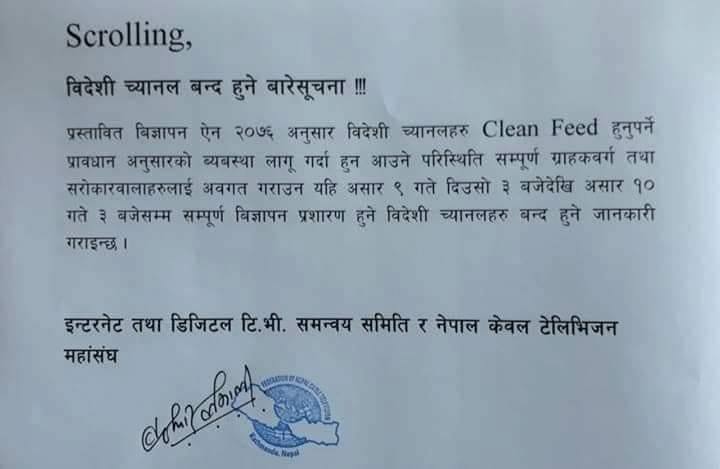 क्लीन फिडको नकारात्मक असर विरुद्ध इन्टरनेट तथा डिजिटल केवल समन्वय समितीको निर्णय अनुसार बिदेशी च्यानलहरु बन्द गरिएको जनाइएको छ ।