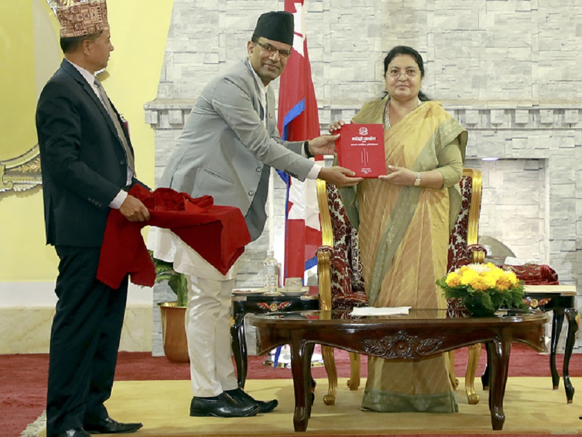 राष्ट्रपति भवन, शीतलनिवासमा आज आयोजित समारोहमा नेपालको संविधानको धारा २९४ बमोजिम राष्ट्रपति भण्डारीसमक्ष कार्यवाहक अध्यक्ष ओझाले प्रतिवेदन पेश गर्नुभएको राष्ट्रपति कार्यालयका प्रवक्ता हरिप्रसाद दाहालद्वारा जारी विज्ञप्तिमा जनाइएको छ ।