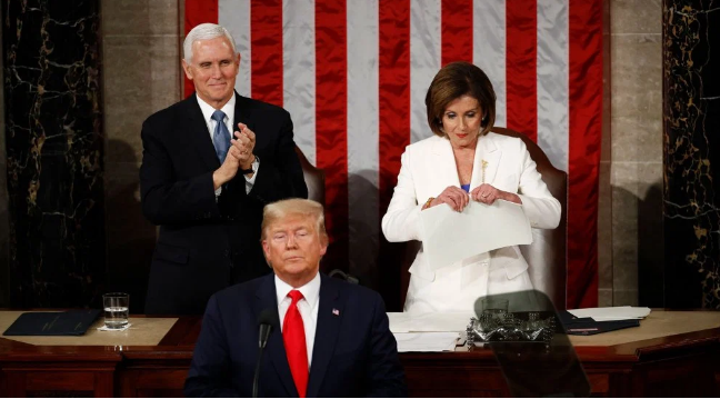 संसद्मा राष्ट्रपति ट्रम्पले ‘स्टेट अफ् युनियन स्पीच’दिएका थिए। ट्रम्पले सम्बोधन सकेर फर्कने क्रममा सभामुखले हात अघि बढाइन्। तर ट्रम्पले हात मिलाउन चाहेनन्। ट्रम्पको सम्बोधनमा समर्थन जनाउँदै रिपब्लिकन सांसद्हरुले ताली बजाइरहेका थिए। सभामुख पेलोसीले ट्रम्पको सम्बोधनको कपी धुजाधुजा पारेर च्यातिदिइन्।