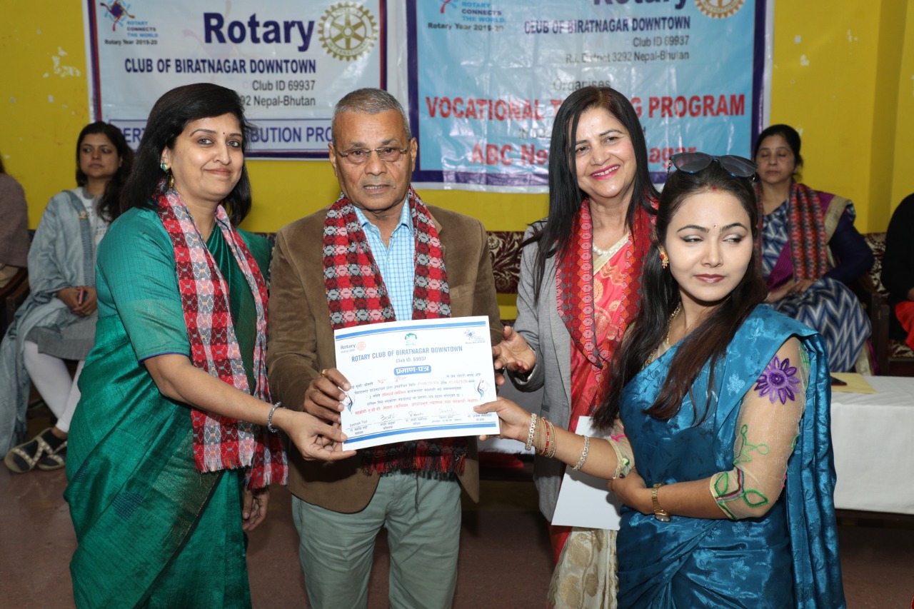 रोटरी क्लव अफ विराटनगर डाउनटाउन र एबीसी नेपालले एक सय जनालाई सीपमुलक तालिम दिएको छ । सौन्दर्य र सिलाई कटाई सम्बन्धी तीन महिने सीपमुलक तालिम बुधबार समापन भएको हो ।