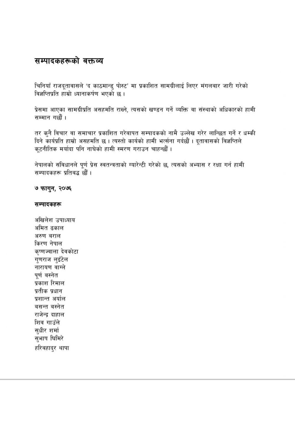 काठमाण्डू पोस्टमा छापिएको समाचारप्रति नेपालस्थित चिनियाँ दूतावासले कूटनीतिक मर्यादा नाघ्दै विज्ञप्ति प्रकाशित गरेको भन्दै सम्पादकहरुले त्यसको भर्त्सना गरेका छन्।