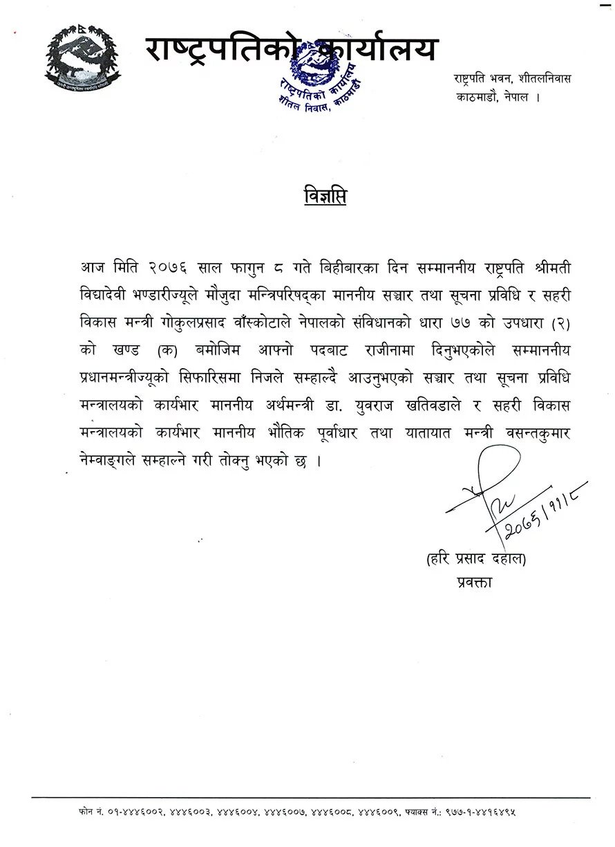 प्रधानमन्त्री केपी शर्मा ओलीले सूचना तथा संचार प्रविधि मन्त्रीबाट गोकुलप्रसाद बाँस्कोटाले दिएको राजीनामा स्वीकृत गरेका छन् । बिहीबार दिउँसो राजीनामा दिएका बाँस्कोटाको राजीनामा स्वीकृत भएको राष्ट्रपतिको कार्यालयले जानकारी दिएको छ।