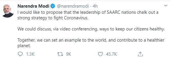 भारतीय प्रधानमन्त्री मोदीले विश्वभर फैलिरहेको कोरोना भाइरसबारे दक्षिण एसियाली क्षेत्रीय सहयोग संगठन (सार्क) का सदस्य राष्ट्रहरुले साझा धारण बनाउनु पर्ने शुक्रवार विहान ट्वीट मार्फत धारणा सार्वजनिक गरेका थिए ।
