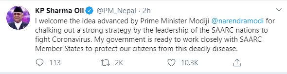 शुक्रबार दिउँसो ट्वीट गर्दै प्रधानमन्त्री ओलीले मोदीको प्रस्तावको स्वागत गर्दै त्यसका लागि नेपाल तयार रहेको बताएका हुन्। भारतीय प्रधानमन्त्री नरेन्द्र मोदीले कोरोनाभाइरस संक्रमण विरुद्ध लड्न सार्क राष्ट्रले साझा तयार गर्नुपर्ने प्रस्ताव औपचारिक रुपमै राखेका थिए । सोही प्रस्ताबको प्रत्युत्तरमा प्रधानमन्त्री ओलीको यस्तो प्रतिक्रिया आएको हो ।