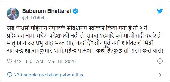 उनले हिन्दीमा ट्वीट गर्दै लेखेका छन्, ‘हाम्रा पूर्वमाओवादी कमरेड मातृका यादव, प्रभु साह, भरत साह कहाँ हुनुहुन्छ? र पूर्व नयाँ शक्तिवाला मित्रहरु रामचन्द्र झा, रामकुमार शर्मा, महेन्द्र पासवान कहाँ हुनुहुन्छ? केही त लाज मान्नुहोस् मित्रहरु’ ।