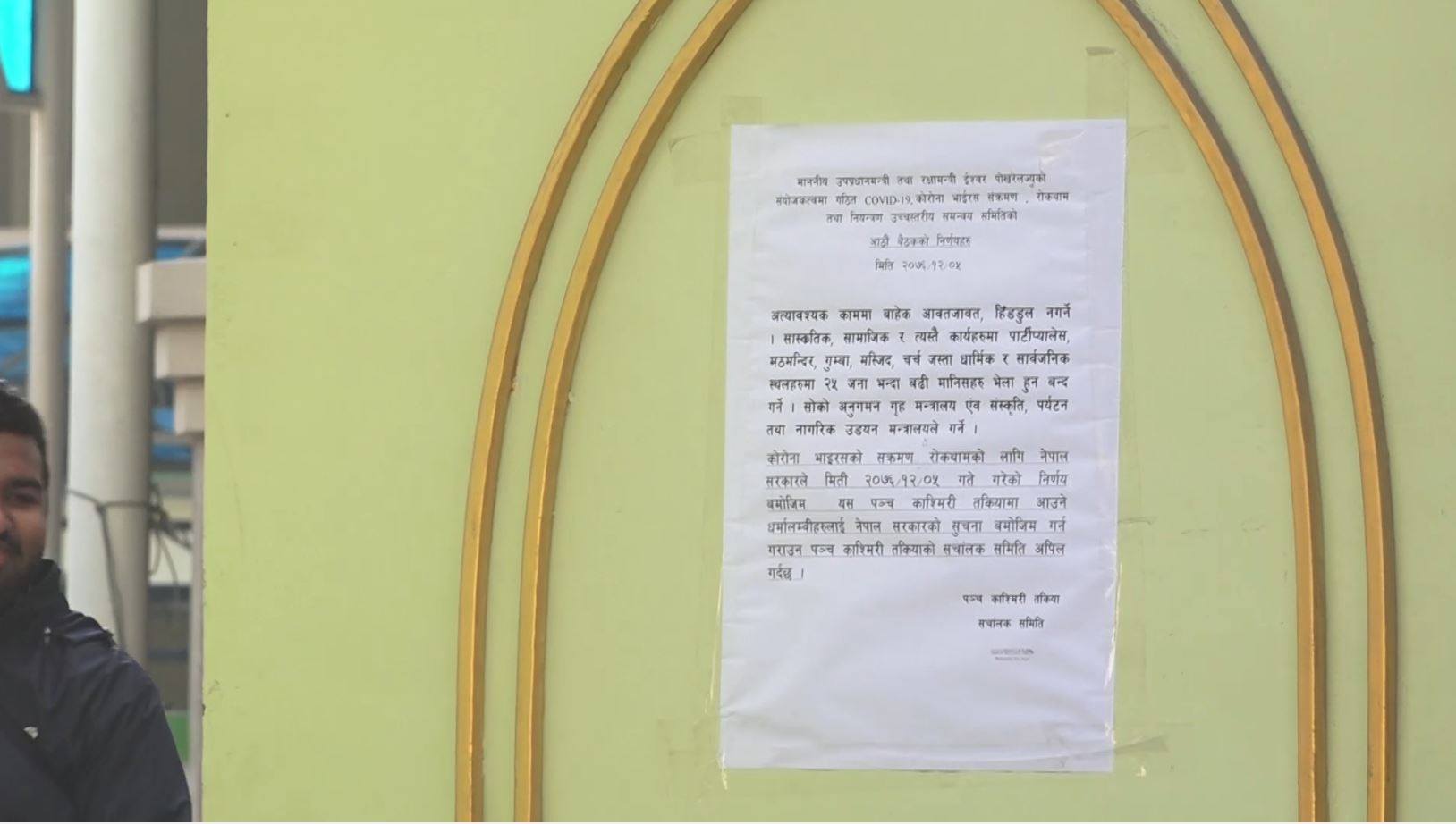 कोभिड—१९ को जोखिमबाट बच्न सरकारले २५ जनाभन्दा बढी भेला नहुन आग्रह गरिसकेको छ । यसअघि बिहीबार संस्कृति पर्यटन तथा नागरिक उड्डयनमन्त्री योगश भट्टराईले धार्मिक गतिविधि सञ्चालनमा पुर्नविचार गर्न आग्रह गरेका थिए ।