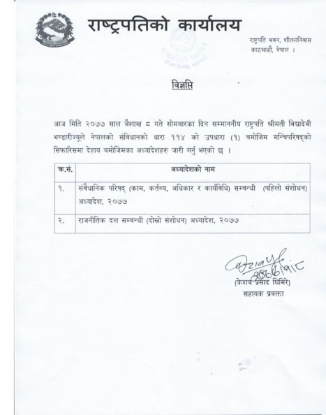 मन्त्रिपरिषद्को सिफारिसमा राजनीतिक दलसम्बन्धी (दोस्रो संशोधन) अध्यादेश र संवैधानिक परिषद् (काम, कर्तव्य, अधिकार र कार्यविधि) सम्बन्धी (पहिलो संशोधन) अध्यादेश, २०७७ लाई प्रमाणीकरण गरेको राष्ट्रपति कार्यालयले जनाएको छ ।