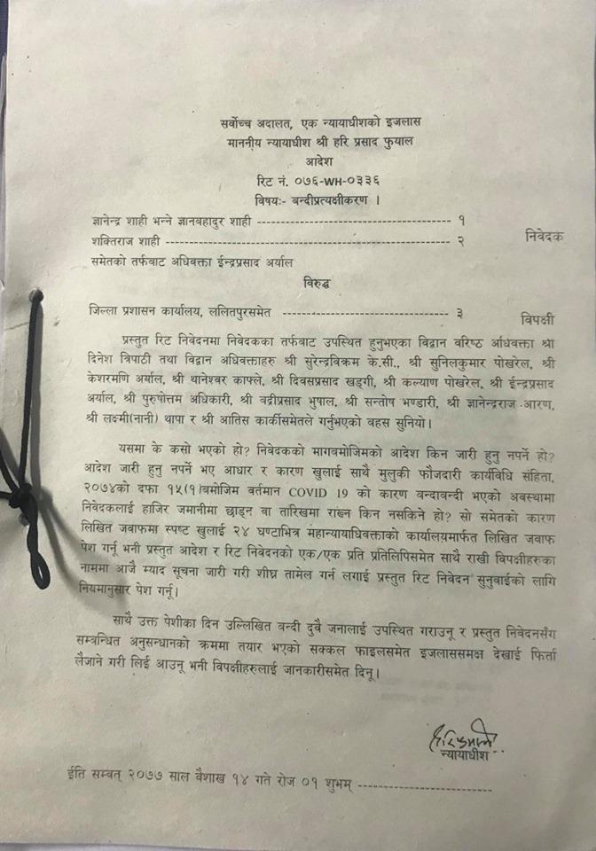 न्यायाधीश हरि फुयाँलको एकल इजलाशले जारी गरेको आदेशमा कोभिड–१९ को संक्रमणको अवस्थामा पक्राउ परेको व्यक्तिलाई पछि उपस्थित गराउने शर्तमा आफन्तको जिम्मा लगाउन सकिने भए पनि किन थुनामै राखेको हो ? कारण पेश गर्न भनेको हो ।