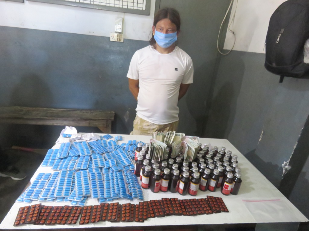 मंगलबार दिउँसो साँढे २ बजे ईलाका प्रहरी कार्यालय धरानबाट खटिएको प्रहरी टोलीले धरान–९ बगैचा टोलबाट १२८० क्याप्सुल स्पास्मो प्रोक्सिवन प्लस, ३०० ट्याबलेट Nitrosun, ८० बोतल DIALEX-DC 100 ML, २ लाख ३७ हजार रुपैँया नगद र मोवाइल १ थान सहित स्थानीय ४१ बर्षीय शुभचन्द्र राईलाई पक्राउ गरेको हो ।