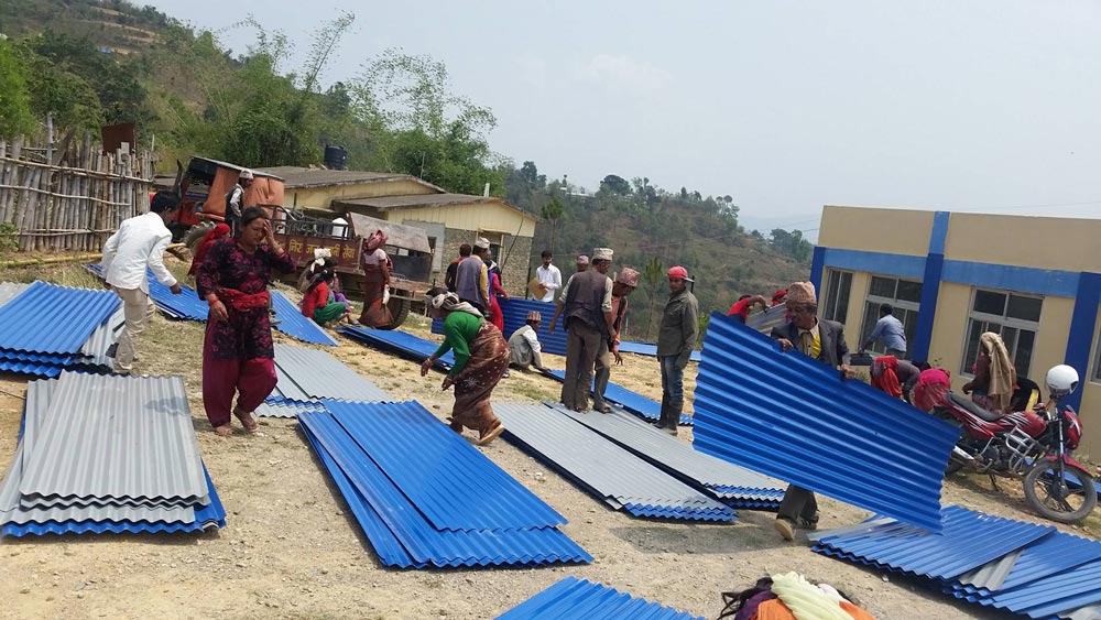 शुक्रबारदेखि गाउँपालिका वडा नं २ मा कार्यक्रम आयोजना गरी जस्तापाता वितरण सुरु गरिएको हो। सबै वडामा कार्यक्रम गरी जस्तापाता वितरण गरिने गाउँपालिकाका उपाध्यक्ष तुलसादेवी श्रेष्ठले बताइन्। खरको छानोमुक्त बनाउने अभियानले गाउँमा खुसीयाली ल्याएको गाउँपालिकाका प्रशासकीय अधिकृत भेषराज पन्थले बताए । वडा कार्यलयका पदाधिकारी र कर्मचारीले लिएको तथ्यांकका आधारमा जसको घरमा खरको छानो छ उसैलाई मात्र दिने नियम बनाइएको छ।