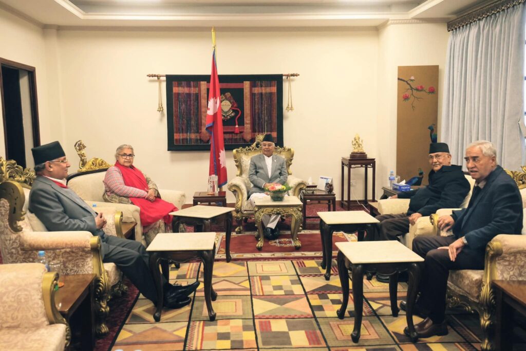 ९ पुष , काठमाण्डौ। राष्ट्रपति रामचन्द्र पौडेलको पहलमा प्रधानमन्त्री सुशीला कार्की र ३ ठूला दलका शीर्षनेताबीच मंगलबार शीतल निवासमा भएको