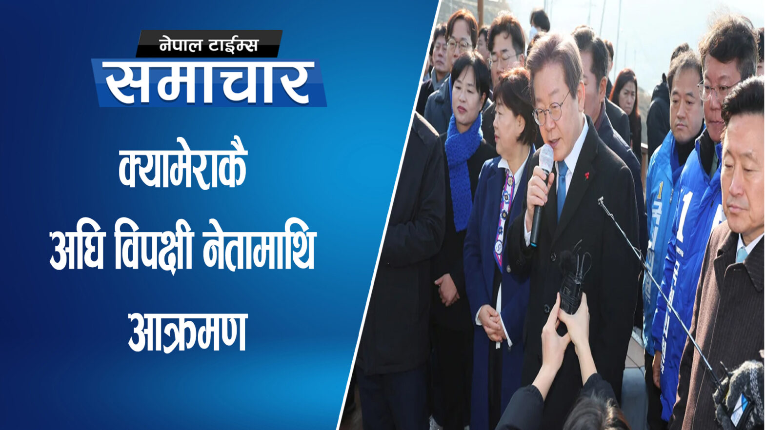 १७ पुष, एजेन्सी । दक्षिण कोरियामा विपक्षी दलका नेता ली जे म्युङमाथि पत्रकार सम्मेलनकै बेला छुरा प्रहार भएको छ । विपक्षी दल डेमोक्रेटिक पार्टी अफ कोरियाका नेता ली जे म्युङ दक्षिणी बन्दरगाह सहर बुसानको भ्रमणमा रहेको बेला आक्रमण भएको योनहाप समाचार एजेन्सीले जनाएको छ । लीलाई एक अज्ञात व्यक्तिले घाँटीको देब्रे भागमा छुरा प्रहार गरेका… Continue reading अटोग्राफ लिने भन्दै नेताको गर्धनमा चक्कु प्रहार